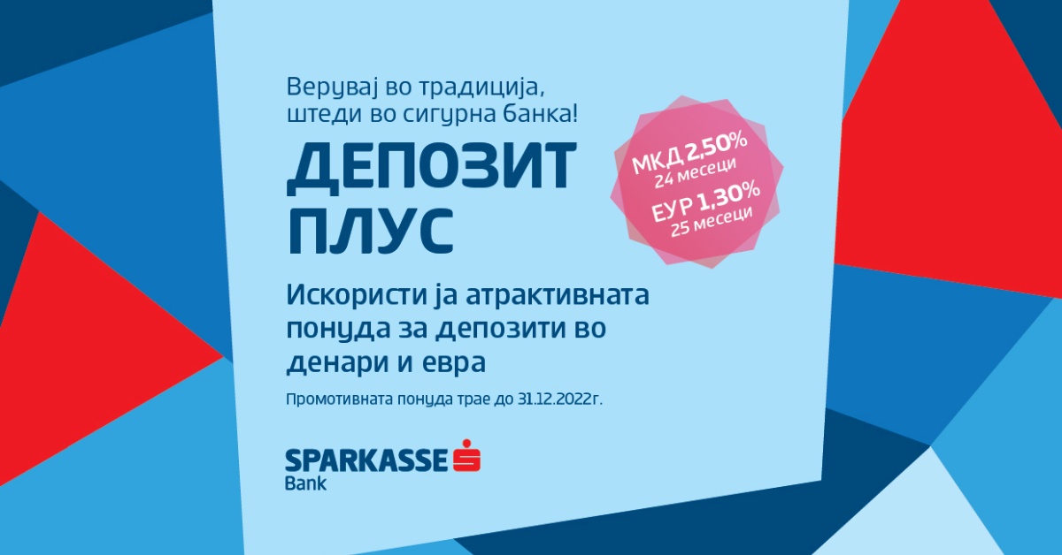 Шпаркасе Банка креираше атрактивна промотивна понуда што трае до 31.12.2022 г. – Депозит Плус со фиксни каматни стапки за целиот период на орочување.