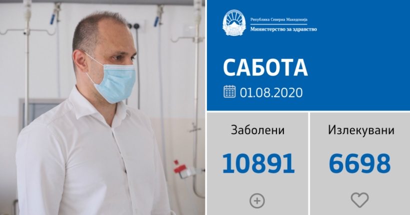 Вкупната бројка на дијагностицирани со КОВИД-19 во нашата земја од почетокот на епидемијата изнесува 10.891, бројката на оздравени пациенти е 6.698, на починати е 493, а во моментов бројот на активни случаи во земјата изнесува 3.700.