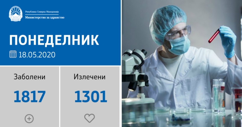 Вкупната бројка на дијагностицирани со КОВИД-19 во нашата земја од почетокот на епидемијата изнесува 1.817, бројката на оздравени пациенти е 1.301, на починати е 104, а во моментов, бројот на активни случаи во земјата изнесува 412.