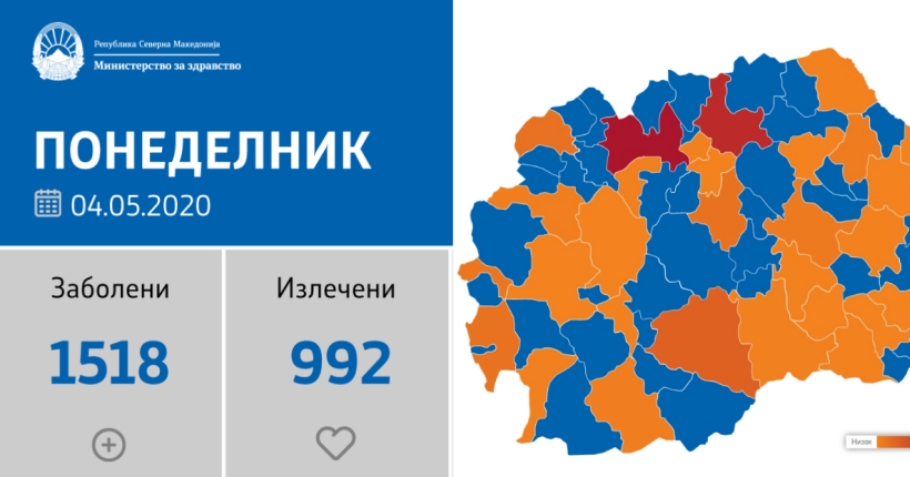 Согласно ова вкупната бројка на дијагностицирани со КОВИД-19 во нашата земја од почетокот на епидемијата изнесува 1.518, бројката на оздравени пациенти е 992, на починати е 85, а во моментов бројот на активни случаи во земјата изнесува 441. Последната дистрибуција по градови е следна: