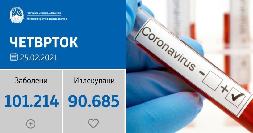 Вкупната бројка на КОВИД-дијагностицирани лица во нашата земја од почетокот на епидемијата изнесува 101.214, бројката на оздравени пациенти е 90.685, на починати е 3.111, а бројот на активни случаи изнесува 7.418.