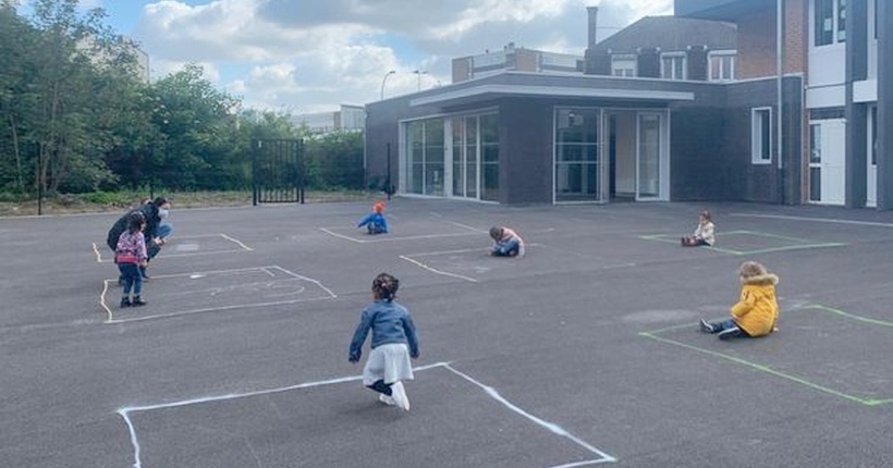 Новата тажна реалност: Деца мораат да си играат на дистанца во зони исцртани со креда во градинка во Франција