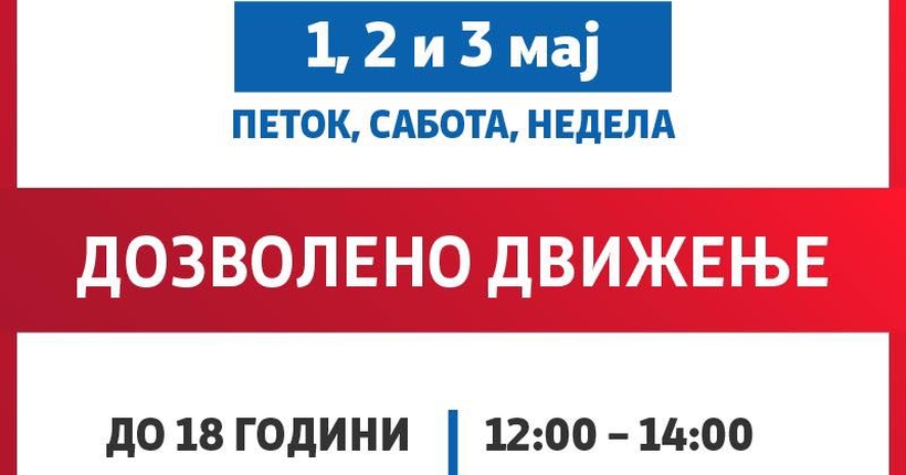 На 1, 2 и 3 мај, односно петок, сабота и недела, ќе биде дозволено движењето на граѓаните од 05:00 часот наутро до 14:00 часот. Забраната за движење во целата држава ќе почнува во 14 часот и ќе трае до 5 часот наутро следниот ден.