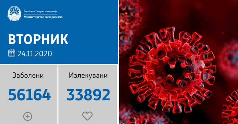 Вкупната бројка на ковид дијагностицирани во нашата земја од почетокот на епидемијата изнесува 56.164, бројката на оздравени пациенти е 33.892, на починати е 1.561, а бројот на активни случаи изнесува 20.711.