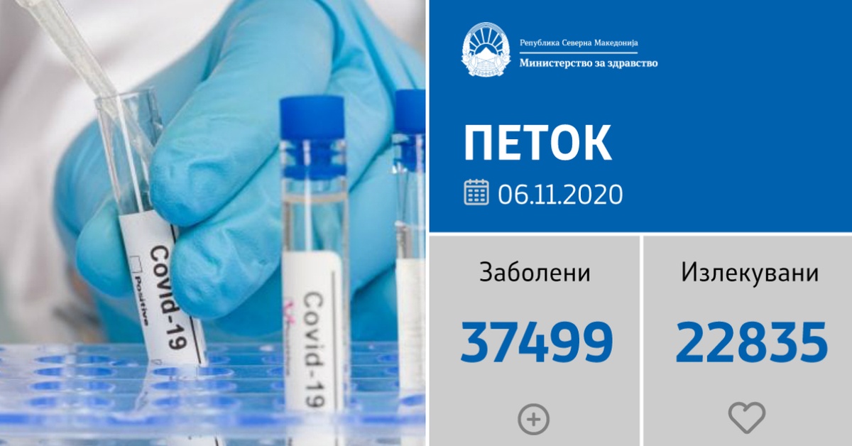 Вкупната бројка на ковид дијагностицирани во нашата земја од почетокот на епидемијата изнесува 37.499, бројката на оздравени пациенти е 22.835, на починати е 1.096, а бројот на активни случаи изнесува 13.568.