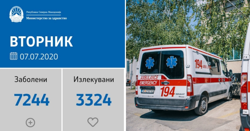 Вкупната бројка на ковид дијагностицирани во нашата земја од почетокот на епидемијата изнесува 7.244, бројката на оздравени пациенти е 3.324, на починати е 351, а во моментов бројот на активни случаи во земјата изнесува 3.569.