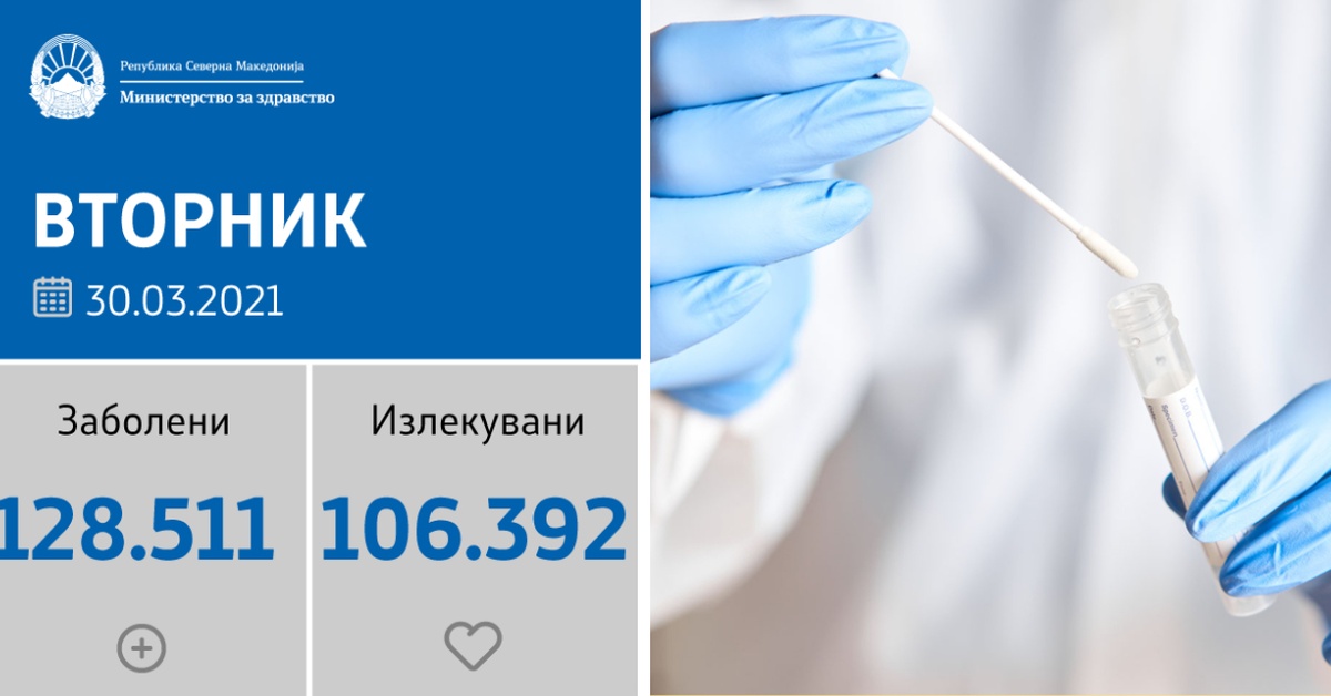 Вкупната бројка на КОВИД-дијагностицирани лица во нашата земја од почетокот на епидемијата изнесува 128.511, бројката на оздравени пациенти е 106.392, на починати е 3.749, а бројот на активни случаи изнесува 18.370.