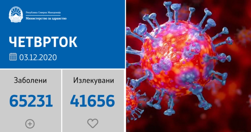 Вкупната бројка на ковид дијагностицирани во нашата земја од почетокот на епидемијата изнесува 65.231, бројката на оздравени пациенти е 41.656, на починати е 1.847, а бројот на активни случаи изнесува 21.728.