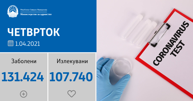 Вкупната бројка на КОВИД-дијагностицирани лица во нашата земја од почетокот на епидемијата изнесува 131.424, бројката на оздравени пациенти е 107.740, на починати е 3.810, а бројот на активни случаи изнесува 19.874.