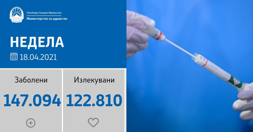 Вкупната бројка на КОВИД-дијагностицирани лица во нашата земја од почетокот на епидемијата изнесува 147.094, бројката на оздравени пациенти е 122.810, на починати е 4.443, а бројот на активни случаи изнесува 19.841.
