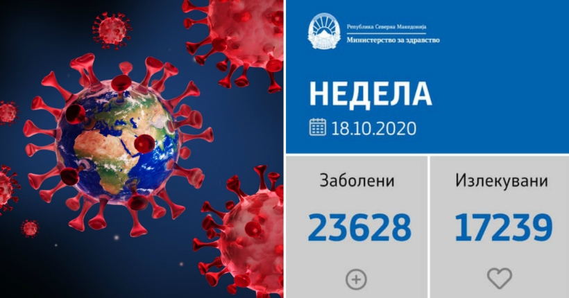 Вкупната бројка на ковид дијагностицирани во нашата земја од почетокот на епидемијата изнесува 23.628, бројката на оздравени пациенти е 17.239, на починати е 834, а во моментов бројот на активни случаи во земјата изнесува 5.555.