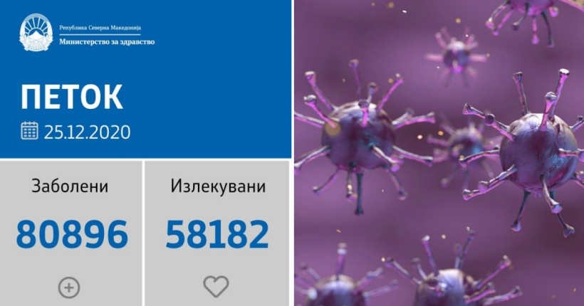 Вкупната бројка на ковид дијагностицирани во нашата земја од почетокот на епидемијата изнесува 80.896, бројката на оздравени пациенти е 58.182, на починати е 2.401, а бројот на активни случаи изнесува 20.313.