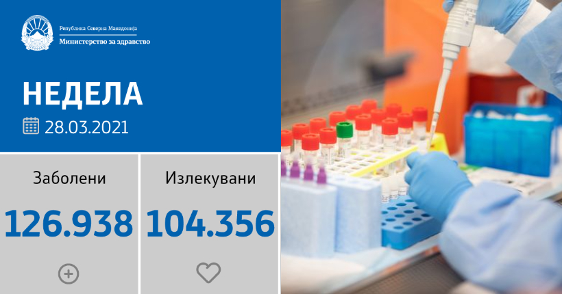 Вкупната бројка на КОВИД-дијагностицирани лица во нашата земја од почетокот на епидемијата изнесува 126.938, бројката на оздравени пациенти е 104.356, на починати е 3.675, а бројот на активни случаи изнесува 18.907.
