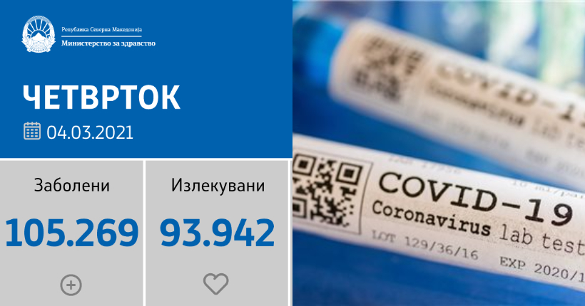 Вкупната бројка на КОВИД-дијагностицирани лица во нашата земја од почетокот на епидемијата изнесува 105.269, бројката на оздравени пациенти е 93.942, на починати е 3.165, а бројот на активни случаи изнесува 8.162.