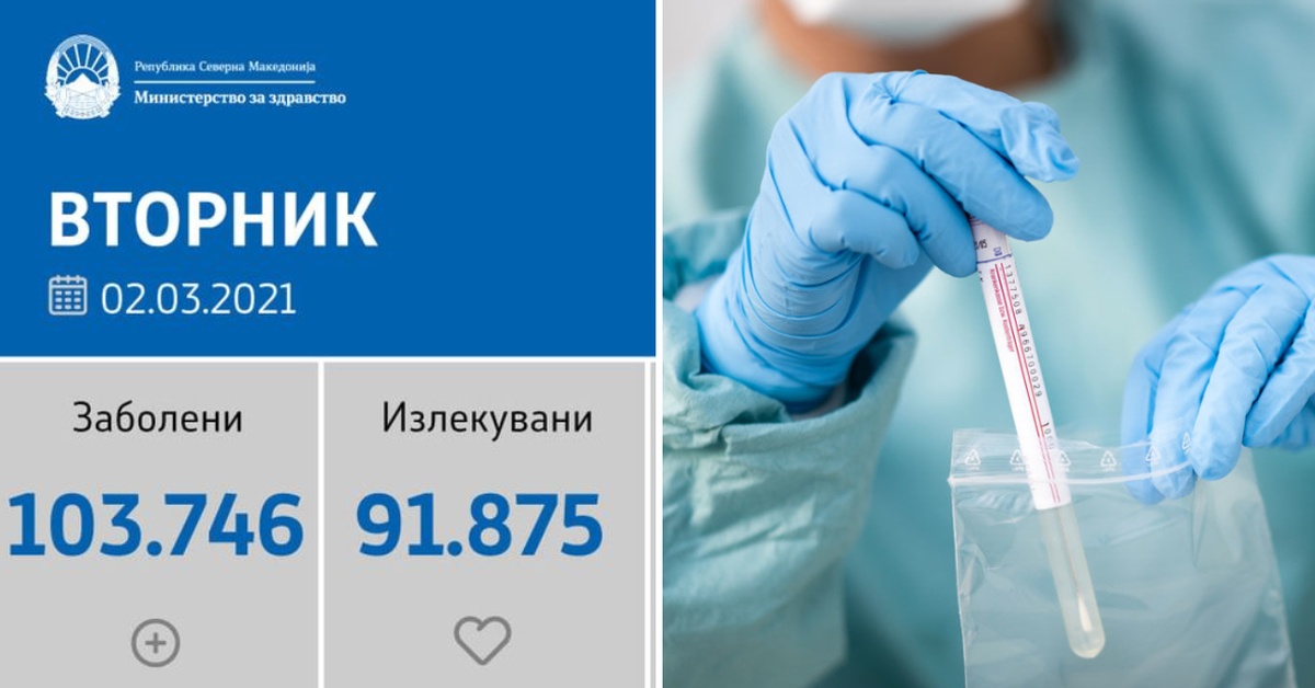 Вкупната бројка на КОВИД-дијагностицирани лица во нашата земја од почетокот на епидемијата изнесува 103.746, бројката на оздравени пациенти е 91.875, на починати е 3.151, а бројот на активни случаи изнесува 8.720.