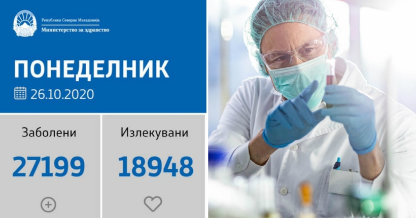 Вкупната бројка на ковид дијагностицирани во нашата земја од почетокот на епидемијата изнесува 27.199, бројката на оздравени пациенти е 18.948, на починати е 934, а бројот на активни случаи изнесува 7.317.
