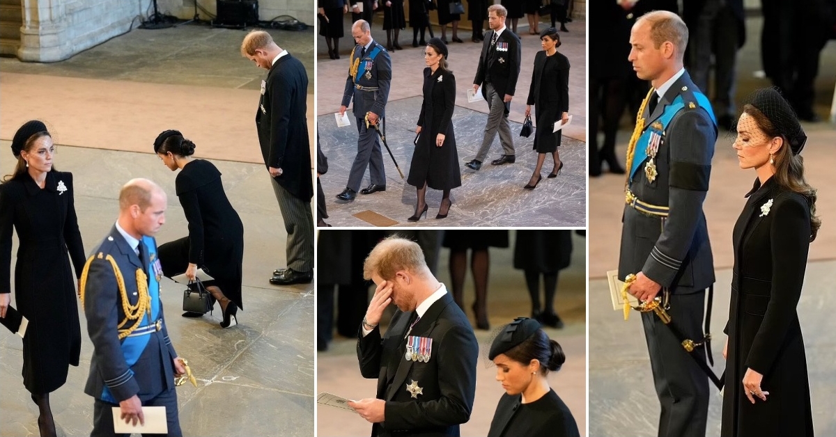 40-годишната принцеза на Велс и 41-годишната војвотка од Сасекс полни со емоции стоеја покрај своите сопрузи. Претходно, двајцата браќа чекореа зад ковчегот на нивната покојна баба, додека Меган и Кетрин пристигнаа во различни автомобили.