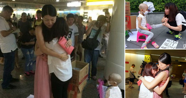 Очајната Чен Деѓуен беше фотографирана на метро станица со порака дека една прегратка чини 10 кинески јуани. На фотографиите, веднаш до неа седи малото девојче со маска на лицето, а пред неа има документи кои потврдуваат дека станува збор за вистински случај, а не измама.