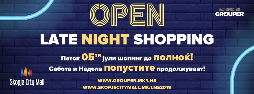 „Како и секоја година побторно омилениот летен шопинг настан на нашите посетители е тука! А ние знаеме дека секој од вас некогаш немал доволно време за сѐ да разгледате и да проба, а уште повеќе кога има огромни попусти на омилените брендови? Токму тоа е „Late night shopping“, викенд со смеа, забава, музика и весело летно расположение,а вие ќе можете да купувате сѐ до полноќ! Ова е најголемиот настан на Скопје Сити Мол во летниот период, настан кадешто шопингот е во друга димензија, а забавата е загарантирана.Оваа година љубителите на шопингот ќе можат да уживаат во екстра попуст и однапред да дознаат што ќе понудат нивните омилени брендови. Веќе од среда, попустите се достапни за јавноста на сајтот на Скопје Сити Мол како и на Groupеr.mk каде може да најдете над 50 зделки со атрактивни попусти да си го одберете вашето омилено парче за летната сезона и да купите купон пред почетокот на Late Night Shopping кампањата. Дополнително, Grouper ќе има и два пулта во молот за време на викендот, каде секој ќе може да се информира за кампањата и да сврти на Среќното тркало, за да добие подарок или дополнителен попуст“ – велат организаторите.