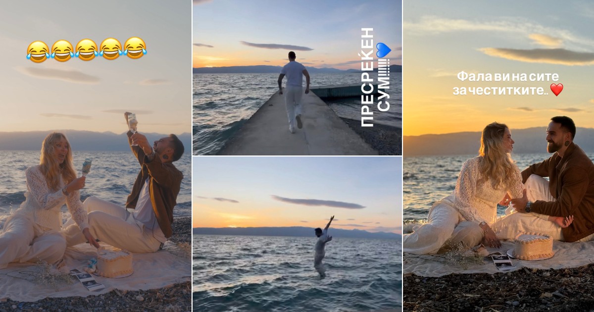 Сега, брачната двојка реши да го открие и полот на бебето, организирајќи емотивен „gender reveal“ покрај Охридското Езеро. И двајцата со чаши извлекоа парчиња од торта чија внатрешност беше во сина боја, индикатор дека ќе добијат синче.