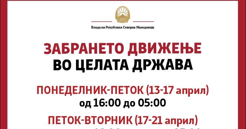 За време на викендот, вклучително и понеделник, од петок 17-ти април во 16:00 часот, до вторник 21-ви април во 05:00 часот, се забранува движењето за сите граѓани на територијата на целата држава.