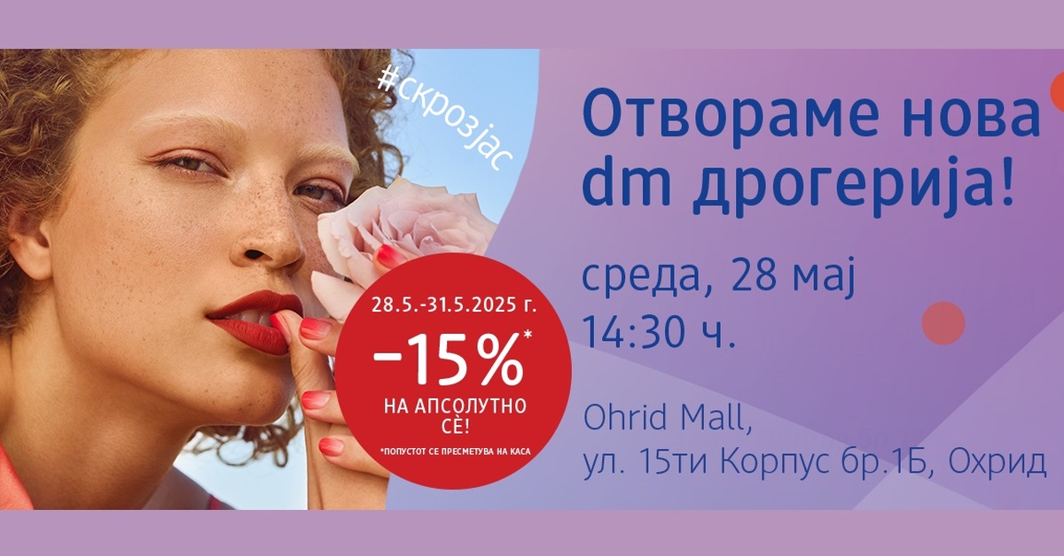 На 28 мај dm ги реотвора вратите на нивната дрогерија во Охрид, но на нова локација – во Ohrid Mall на ул. 15-ти Корпус бр. 1Б. Официјалното отворање на трговскиот центар ќе биде од 12:30 часот, додека вратите ќе бидат отворени за посетители од 14:30 часот.