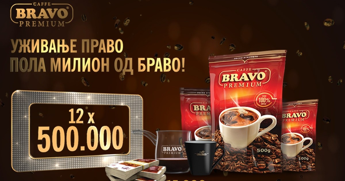 Уживање право и 12 добивки по половина милион денари за најверните купувачи на Браво кафе Премиум во 2022 година.
