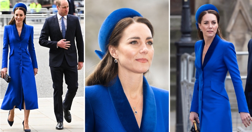 40-годишната Војвотка изгледаше отмено во комбинација во кралска сина нијанса која вклучуваше палто од Кетрин Вокер и накит со сафири кој одлично си одговара со нејзиниот свршенички прстен кој претходно ѝ припаѓаше на принцезата Дијана.