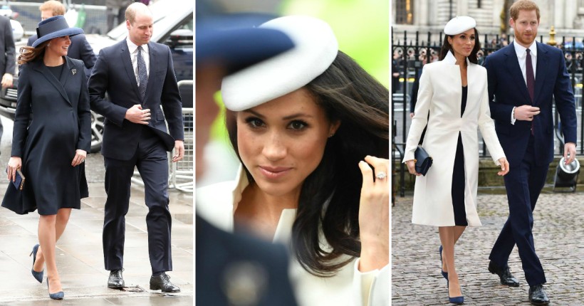 Меган блесна во бело палто од Аманда Вејкли и соодветна беретка, додека бремената војвотка се појави во тегет креација од луксузниот бренд Beulah London.