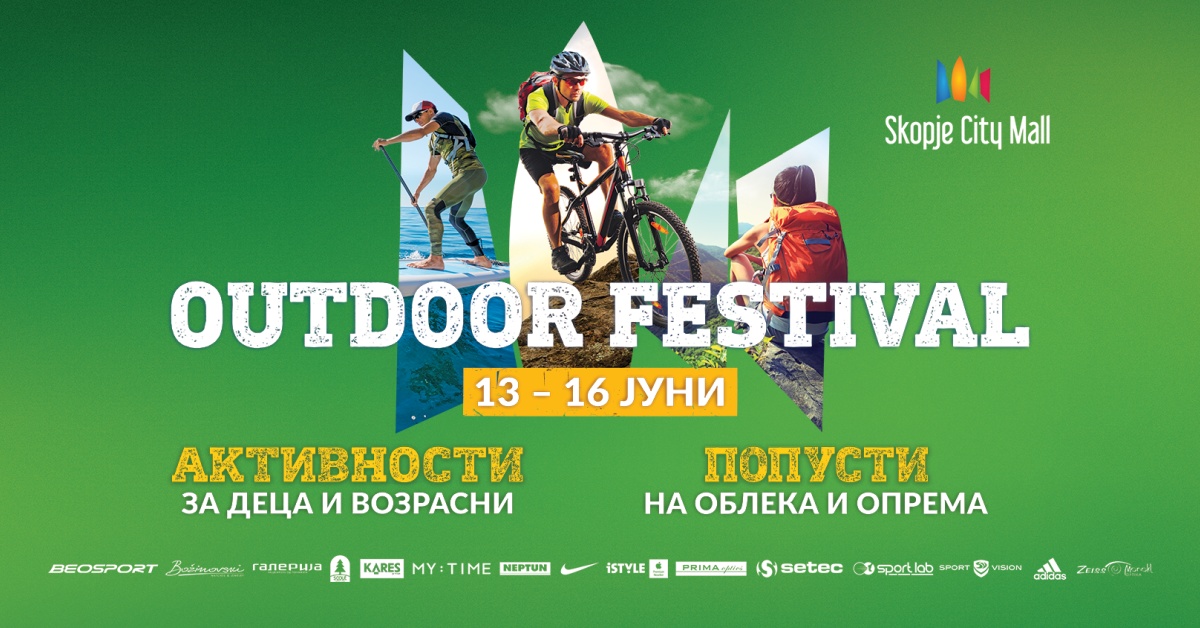 Скопје Сити Мол ве поканува на Outdoor Festival од 13 јуни до 16 јуни каде посетителите ќе имаат можност да се едуцираат за разни outdoor активности и да ги искористат попустите за outdoor опрема и облека. Во рамки на првите три дена ќе се одржат панел дискусии во Cineplexx за outdoor спортовите, за физичкото здравје и ќе се споделуваат лични искуства и совети од наши истакнати спортисти.