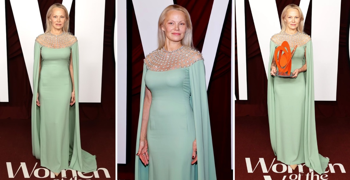 Памела Андерсон во креација со наметка и минимална шминка на доделувањето на наградите „Жени на годината“
