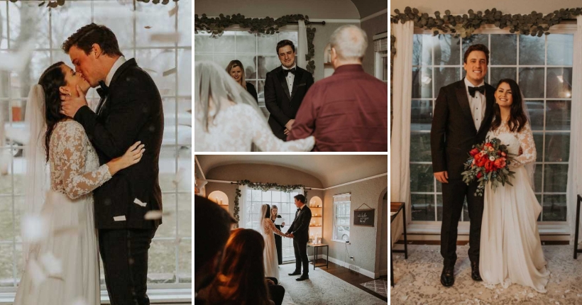 „Сред целиот овој хаос, одлучивме дека немаме ништо против да ја одложиме нашата свадба, но не сакавме да го одложиме нашиот брак. Одлучивме дека најзначајното место за да го започнеме нашиот брак би бил нашиот дом. Го тргнавме целиот мебел од нашата дневна соба, поставивме столици и изработивме олтар. Ги искористивме свеќите коишто ги имавме како декорација за да создадеме амбиент и поставивме конфети за нашиот голем бакнеж.“