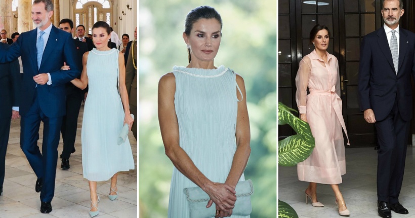 За посетата на Големиот театар, каде беа топло пречекани од граѓаните, Летиција носеше светлосин плисиран фустан од Нина Ричи и истобојни чанта и обувки од еден од нејзините омилени брендови Магрит.
