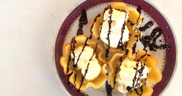 - Откако ќе фатат малку кора на краевите, реагирајте брзо – Со шпатула вадете ги и ставајте ги во мали длабоки садови за да добијат форма. Штом ќе се зацврстат, извадете ги од садовите и во нив ставете од сладоледот. Декорирајте по желба.