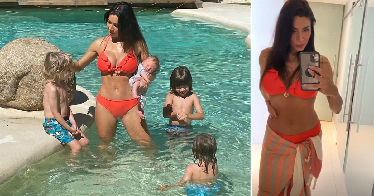 Познатата шпанска водителка сподели фотографија со четирите синчиња во базен. На неа, таа позира во црвени бикини, додека во рацете го држи новородениот Максимо Адријано.