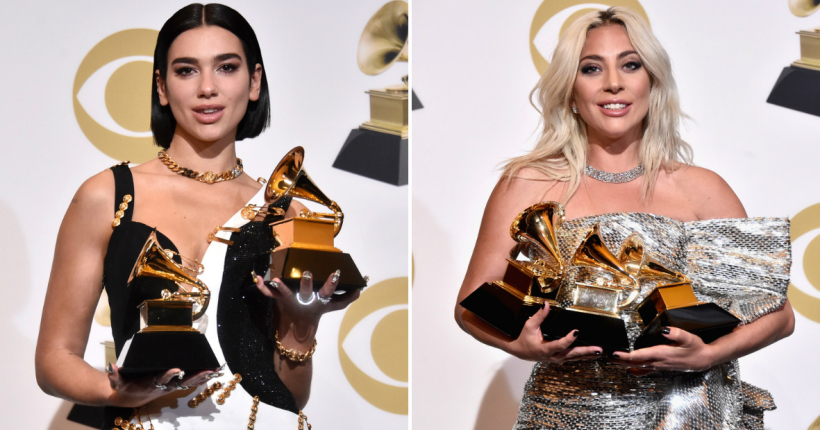 Лејди Гага ја напушти манифестацијата со три златни грамофони и со доминација во категориите посветени на поп музиката. Ѕвездата од филмот „A Star Is Born“ и нејзиниот колега Бредли Купер победија во категориите Најдобра поп изведба на дуо или група и Најдобра песна напишана за филм за „Shallow“. Лејди Гага победи и во категоријата Најдобра соло изведбаза „ Joanne (Where Do You Think You’re Goin’?)“.