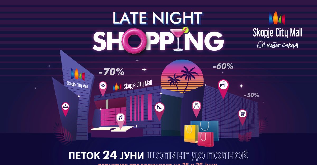 На 24 јуни вратите на Скопје Сити Мол се отвораат во 10 часот наутро за да ги примат “шопингхоличарите“, но и оние кои го чекаат попустот за да го купат омиленото парче и забавата може да почне. Единствено со Скопје Сити Мол има сѐ што сакате со ексклузивни попусти, па искористете го Late Night Shopping да го купите омиленото парче облека, обувки, асесоари, накит, козметика, подгответе се за плажа со нов костим за капење, нов куфер или купете нешто за домот.