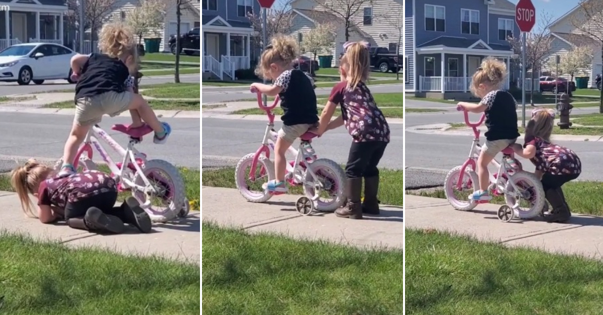 Видео од две сестрички стана вирален хит на социјалните мрежи. Во него, поголемото девојче легнува за да ѝ помогне на својата помала сестричка да се качи на велосипедот.