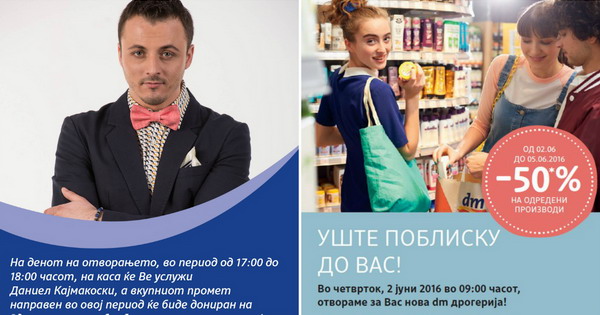 Во период од 17:00 до 18:00 часот на каса ќе ве услужи Даниел Кајмакоски, кој со својата едночасовна дружба со вас ќе придонесе кон хуманитарната активност која е дел од секое отворање на нов dm објект. Имено, прометот направен во овој час ќе биде дониран во Здружението за борба против рак и леукемија кај деца - „Пеперутка“!
