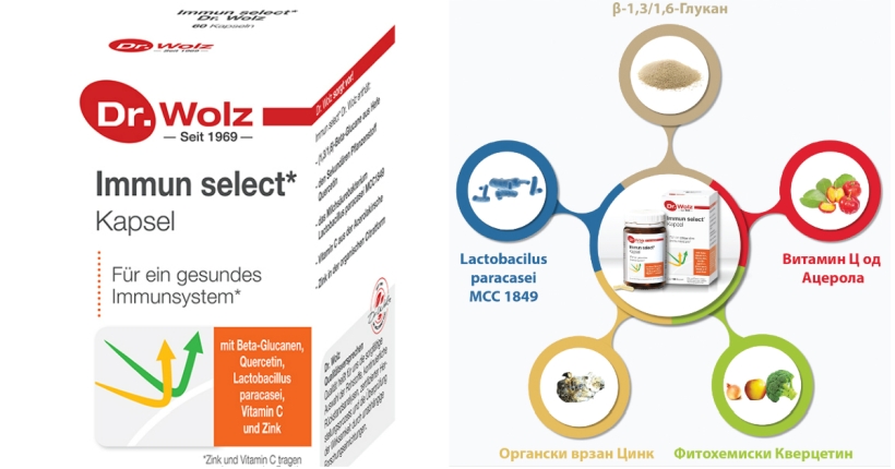 Immun Select Dr. Wolz претставува иновативна комбинација на микронутриенти, во кои се клучни имун-активните супстанции и антиоксидантите, како витаминот Ц (од ацерола) и органски врзаниот цинк, кои се комбинираат во природен имуноактивен комплекс, инкорпориран со биоактивната супстанција бета-1,3 / 1,6- глукан (од ѕидот на квасните клетки), млечно-киселинската бактерија Lactobacillus paracasei MCC1849 и фитохемискиот антиоксиданс кверцетин.