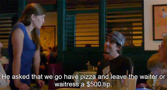 Изненадената келнерка ги зема парите и вели: „Дали си сериозен? Не знам што да направам... Ќе ја раскажувам оваа приказна до крајот на мојот живот“. Исто така, таа вели дека дел од парите ќе им даде и на вработените во кујната на ресторанот.