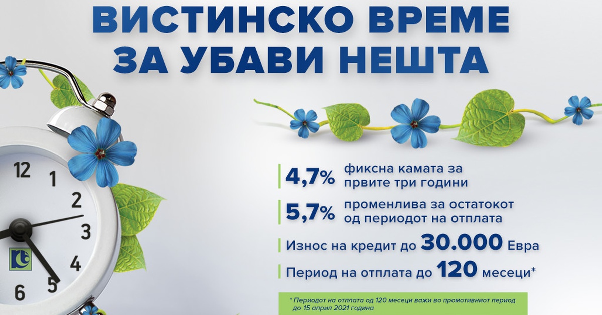 Станбениот кредит е со рок на отплата до 30 години и сега веќе е достапен со каматни стапки од 2,9% годишна, фиксна за првите 5 години, и 3,9% годишна, променлива за остатокот од периодот за отплата на кредитот. Втората опција е да се земе со годишни каматни стапки од 3%, фиксна за првите 10 години, и 3,9%, променлива за остатокот од периодот за отплата.