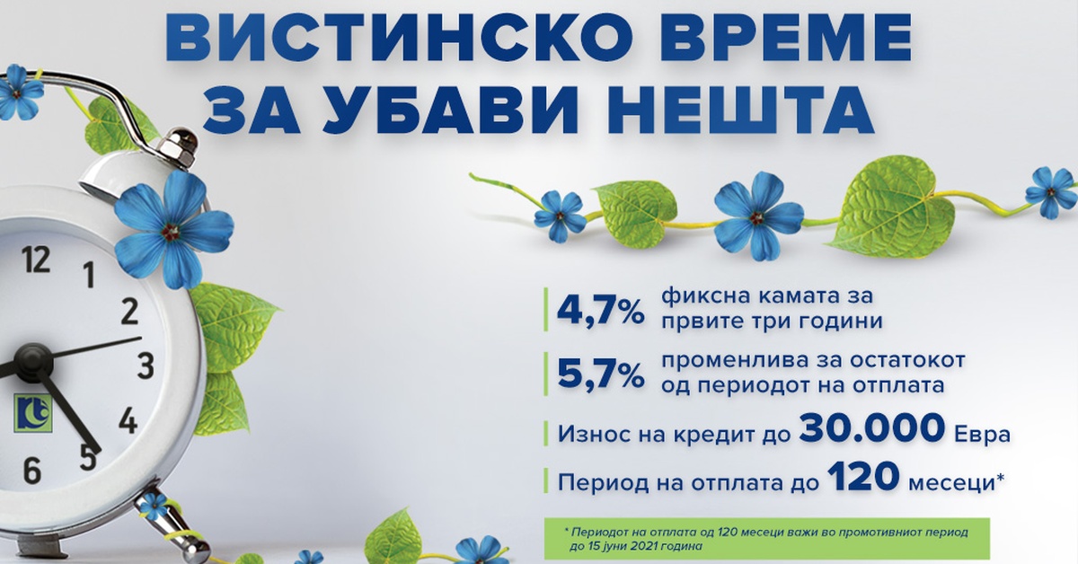 Промотивниот период за отплата до 120 месеци продолжува до 15.06.2021 година, со што граѓаните добија дополнителна можност да ги искористат сите поволности на овој кредит и да го купат тоа што веќе го посакале и испланирале.