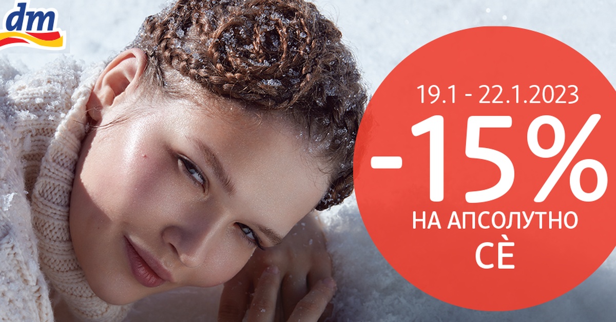 Заради реновирање, дрогеријата во ТЦ City Mall во период од 23.01 до 22.02.2023 година ќе биде затворена. По тој повод, dm на своите купувачи им нуди –15% попуст на АПСОЛУТНО СЀ..и на веќе намалените производи! Овие попусти ќе траат од