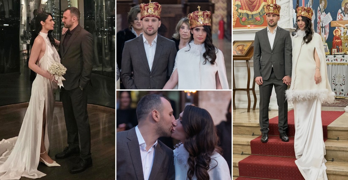 Убавата невеста, која со Дејан го очекува своето прво дете, избра венчаница и долга наметка со перја од македонскиот дизајнер Марков, кој објави дел од фотографиите.