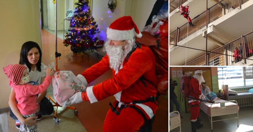 Вработен во Црвениот Крст на град Скопје маскиран како Дедо Мраз со јаже се спушти од покривот за да им подели новогодишни подароци на малите пациенти кои го дочекаа со огромна радост и искрени насмевки.