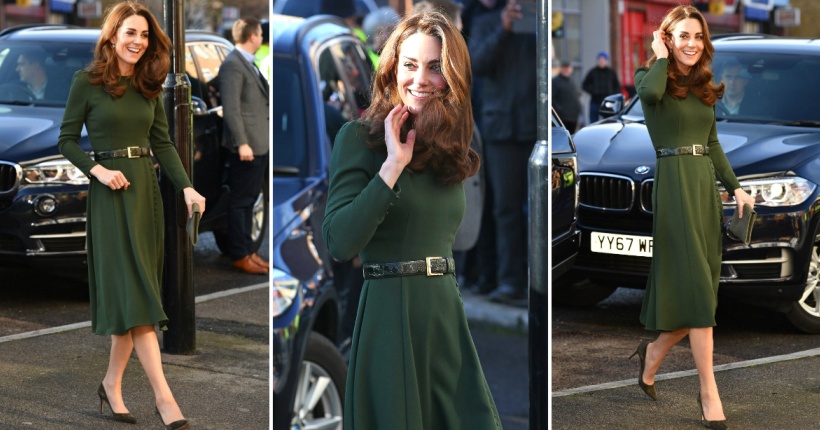 За оваа пригода, шармантната војвотка избра монохроматски стајлинг. Елегантниот зелен фустан, кој доаѓа од брендот Beulah, Кетрин го надополни со дијамантски обетки од Kiki McDonough и зелени обувки и чантичка.