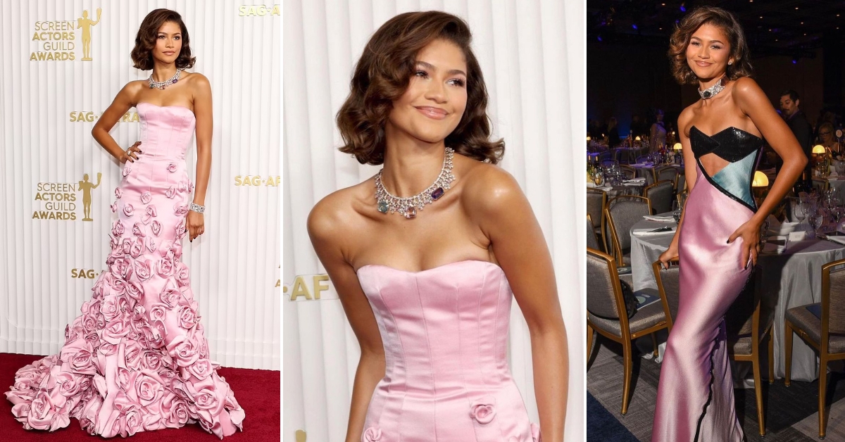 На овогодишното доделување на наградите SAG во Калифорнија, 26-годишната актерка зачекори со стил на црвениот тепих, облечена во розова креација со цветови. Фустанот со 190 ружи бил создаден специјално за неа од Пјерпаоло Пичоли, креативниот директор на Валентино. Својот изглед, ѕвездата од „Euphoria“ го надополни со накит од брендот Bulgari.