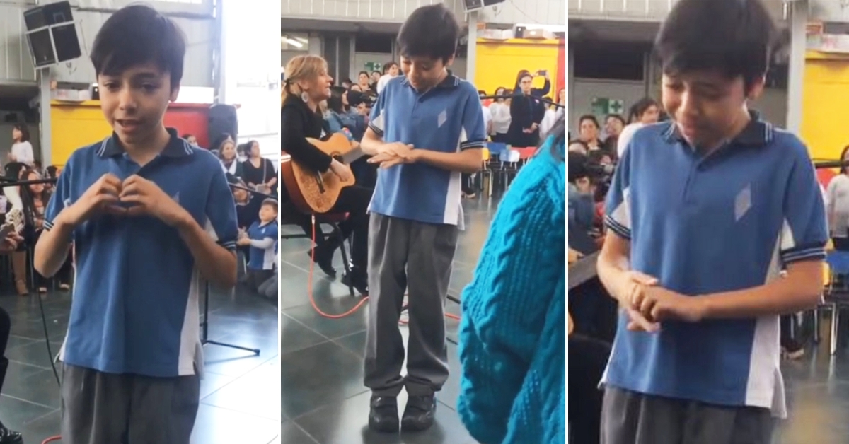 This sweet boy surprises his mom by signing this love song for her. He becomes emotional mid-delivery. The entire school joins in for musical accompaniment. What a beautiful moment!