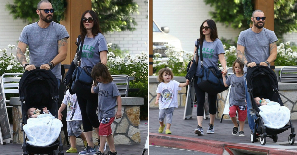 30-годишната актерка беше фотографирана од папараците додека се шеташе во Лос Анџелес со својот сопруг Брајан Остин Грин, 3-месечниот Џурни, 2-годишниот Боди и 4-годишниот Ноа. На фотографиите, Меган ги држи за раце Бои и Ноа, додека Брајан го вози Џурни во количка.